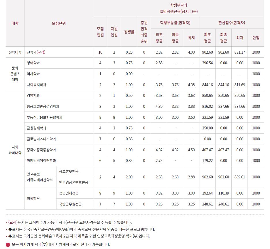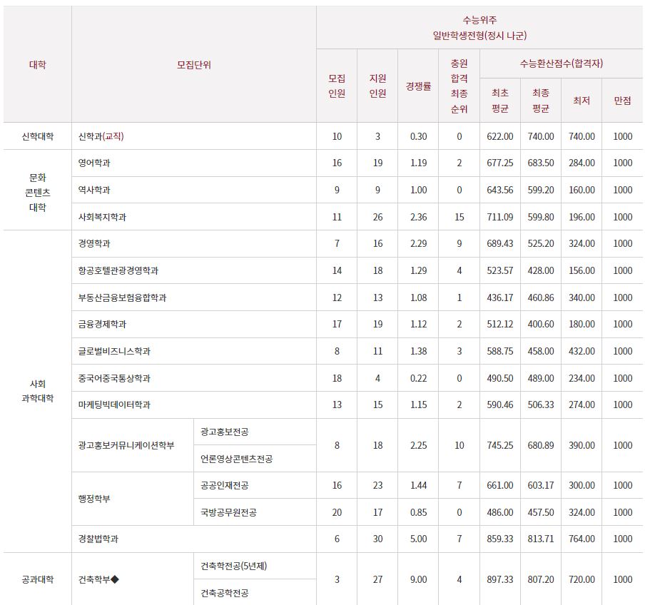 나군 : 신학과, 영어학과, 역사학과, 사회복지학과, 경영학과, 항공호텔관광경영학과, 부동산금융보험융합학과, 금융경제학과, 글로벌비즈니스학과, 중국어중국통상학과, 마케팅빅데이터학과, 광고홍보커뮤니케이션학부 광고홍보전공, 언론영상콘텐츠전공, 행정학부 공공인재전공, 행정학부 국방공무원전공, 경찰법학과, 건축학부 건축학전공(5년제), 건축학부 건축공학전공, 미술교육과
