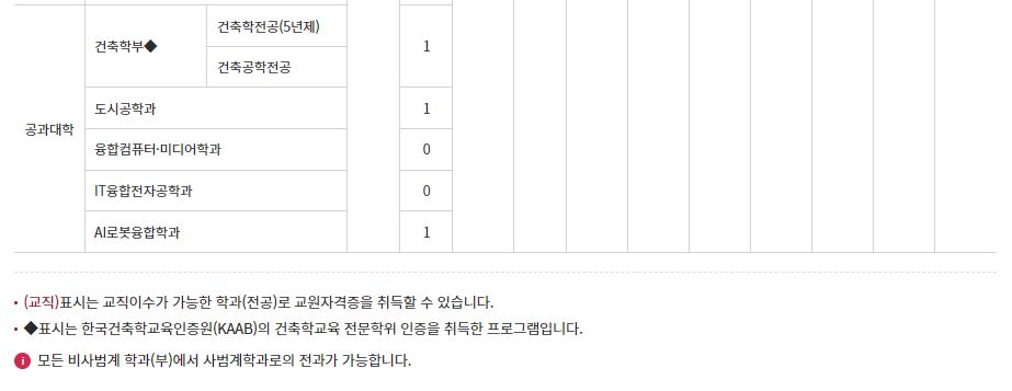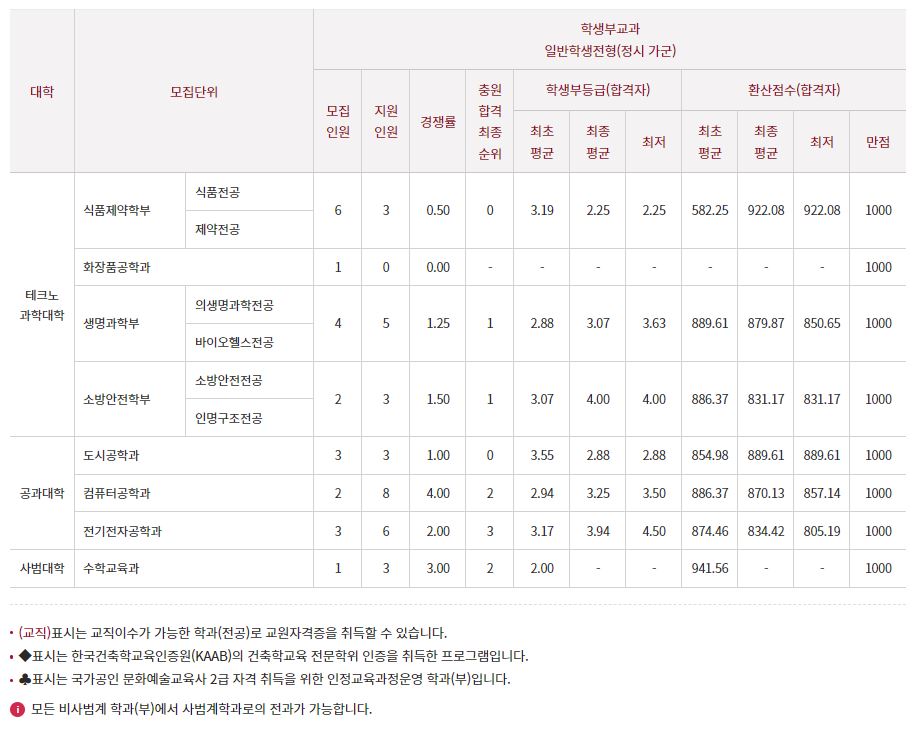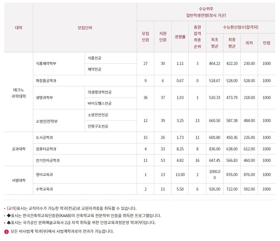 가군 : 식품제약학부 식품전공, 식품제약학부 제약전공, 화장품공학과, 생명과학부 의생명과학전공, 생명과학부 바이오헬스전공, 소방안전학부 소방안전전공, 소방안전학부 인명구조전공, 도시공학과, 컴퓨터공학과, 전기전자공학과, 영어교육과, 수학교육과