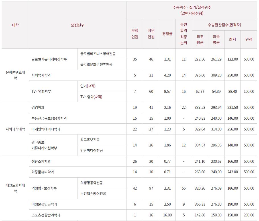 2021학년도에는 신학과, 작곡과, 첨단소재학과, 화장품뷰티학과가 미달이었으며, 나머지 학과 중 가장 경쟁률이 높았던 학과는 스포츠건강관리학과(16.00:1), TV영화학부(8.57:1), 경찰법학과(5.50:1) 순이었습니다.