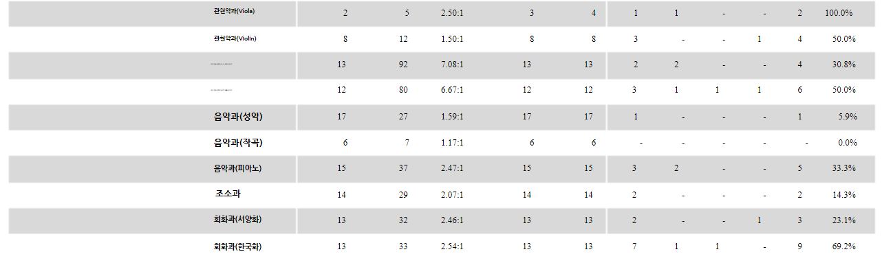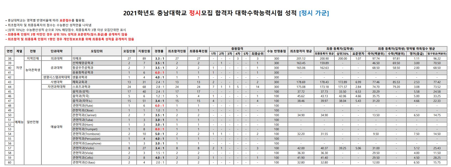 작년 충남대학교의 관현악과(C.Bass), 해양안보학전공(남자)는 미달이었으며, 무용학과(발레), 관현악과(Oboe), 관현악과(Saxophone), 관현악과(Trombone), 관현악과(Tuba)는 지원인원과 모집인원이 같았습니다. 이외의 학과 중 가장 경쟁률이 높았던 학과는 약학과(14.86:1), 식물자원학과(10.22:1), 식물자원학과(농어촌)(10.00:1) 순이었습니다.