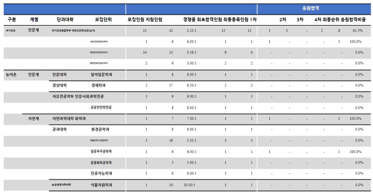 2021학년도 해양안보학전공(남자)는 미달이었으며, 무용학과(한국무용), 관현악과(Oboe), 해양안보학전공(여자)는 지원인원과 모집인원이 동일했습니다. 이외의 학과 중 가장 경쟁률이 높았던 학과는 관현악과(Trumpet)(8.0:1), 수의예과(7.5:1), 경영학부(7.0:1) 순이었습니다.