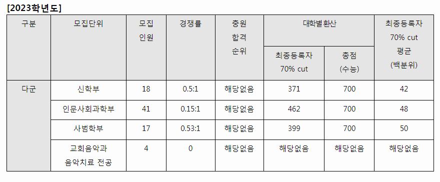 원래는 3개년의 정시 등급을 올리고 있지만, 한국침례신학대학교에서는 작년 정보만을 공개하고 있기에 2023학년도 정보를 중심으로 자료를 분석해보도록 하겠습니다.