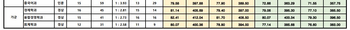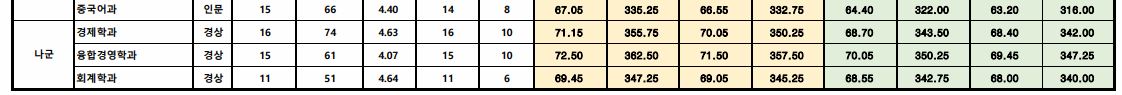 가군 : 전기공학과, 전자공학과, 정보통신공학과, 컴퓨터공학과, 건설환경공학과, 건축공학과, 건축학과(5년제), 도시공학과, 경제학과, 융합경영학과, 회계학과