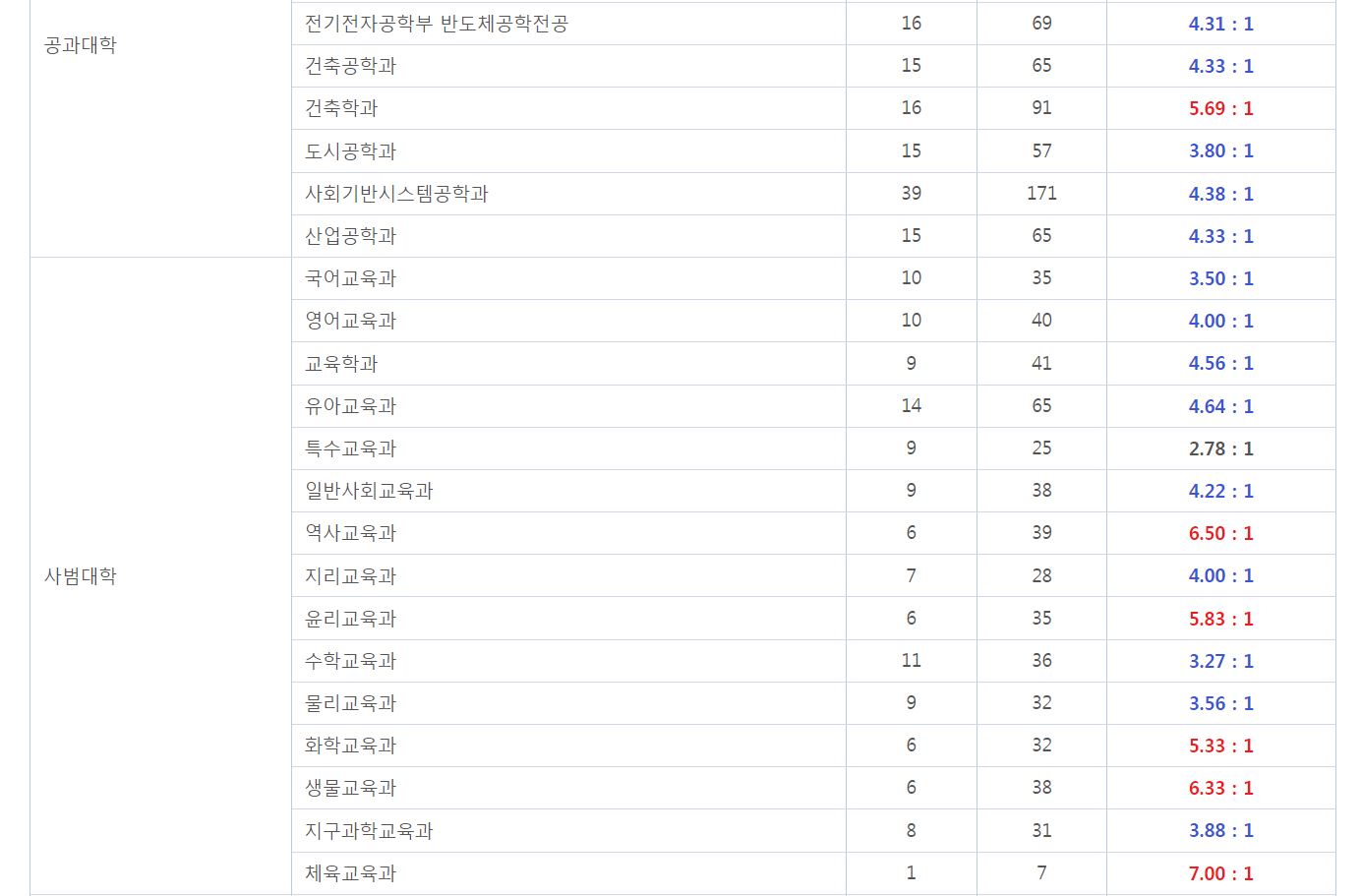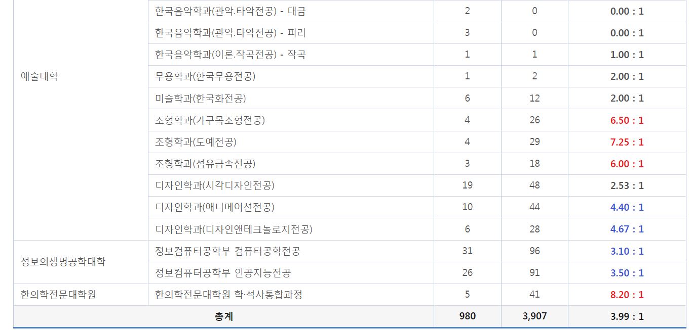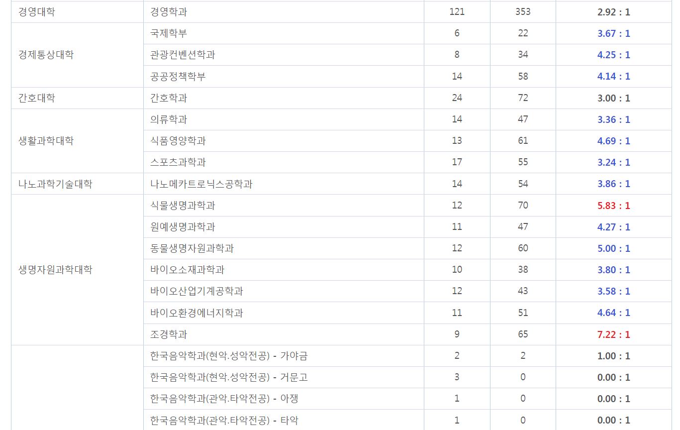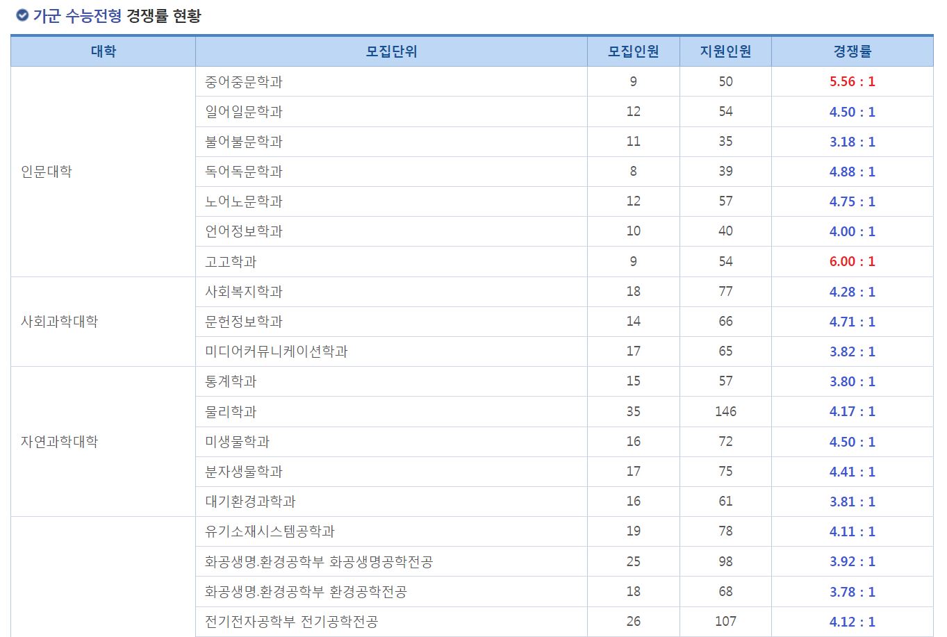 가군 수능전형에서의 한국음악학과(관악.타악전공) 거문고, 아쟁, 타악, 대금, 피리, 작곡은 미달이었으며, 한국음악학과(관악.타악전공) 가야금, 한국음악학과(이론.작곡전공) 작곡 전공은 모집인원과 지원인원이 같았습니다. 이외의 학과 중 가장 경쟁률이 높았던 학과는 한의학전문대학원 학석사통합과정(8.20:1), 조형학과(도예전공)(7.25:1), 조경학과(7.22:1) 순이었습니다.