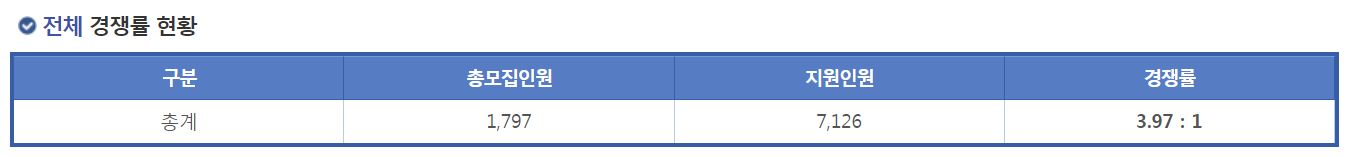 전체 경쟁률 현황 먼저 보겠습니다. 모든 전형을 통틀어서 올해 부산대학교의 경쟁률은 3.97:1 이었습니다.