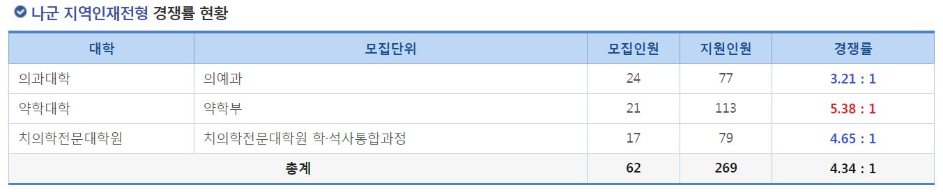 나군 지역인재전형에서는 의예과, 약학부, 치의학전문대학원 학석사통합과정의 신입생을 모집했으며, 의예과의 경쟁률은 3.21:1, 약학부는 5.38:1, 치의학전문대학원 학석사통합과정 경쟁률은 4.65:1 이었습니다.