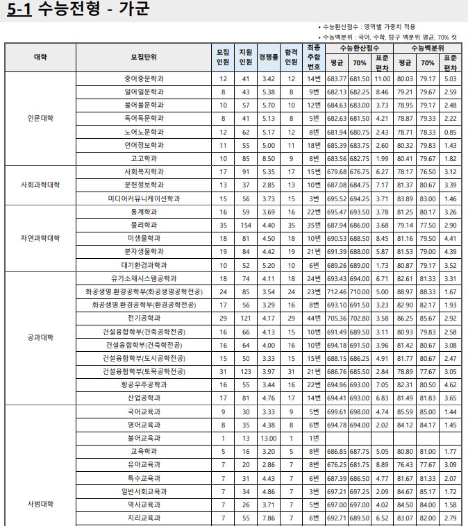 가군 : 중어중문학과, 일어일문학과, 불어불문학과, 독어독문학과, 노어노문학과, 언어정보학과, 고고학과, 사회복지학과, 문헌정보학과, 미디어커뮤니케이션학과, 통계학과, 물리학과, 미생물학과, 분자생물학과, 대기환경과학과, 유기소재시스템공학과, 화공생명 환경공학부(화공생명공학전공), 화공생명 환경공학부(환경공학전공), 전기공학과, 건설융합학부(건축공학전공), 건설융합학부(건축공학전공), 건설융합학부(도시공학전공), 건설융합학부(토목공학전공), 항공우주공학과, 산업공학과, 국어교육과, 영어교육과, 불어교육과, 교육학과, 유아교육과, 특수교육과, 일반사회교육과, 역사교육과, 지리교육과, 윤리교육과, 수학교육과, 물리교육과, 화학교육과, 생물교육과, 지구과학교육과, 경영학과, 관광컨벤션학과, 공공정책학부, 간호학과, 의류학과, 식품영양학과, 디자인학과(디자인앤테크놀로지전공), 식물생명과학과, 원예생명과학과, 동물생명자원과학과, 바이오소재과학과, 바이오산업기계공학과, 바이오환경에너지학과, 조경학과, 나노메카트로닉스공학과, 치의학전문대학원(학석사통합과정), 한의학전문대학원(학석사통합과정), 정보컴퓨터공학부(컴퓨터공학전공), 정보컴퓨터공학부(인공지능전공), 스포츠과학과, 미술학과(한국화전공), 조형학과(가구목조형전공), 조형학과(도예전공), 조형학과(섬유금속전공), 디자인학과(시각디자인전공), 디자인학과(애니메이션전공), 무용학과(한국무용전공), 한국음악학과(현악 성악전공), 간호학과(지역인재)