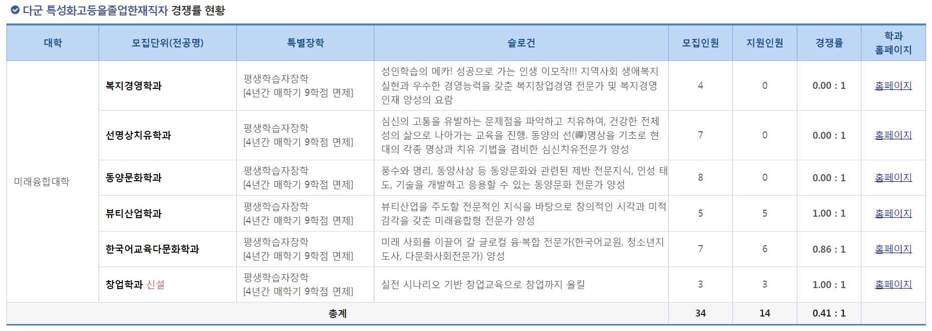 다군 특성화고등을졸업한재직자전형의 복지경영학과, 선명상치유학과, 동양문화학과, 한국어교육다문화학과는 미달이었으며, 뷰티산업학과, 창업학과는 모집인원과 지원인원이 같았습니다.