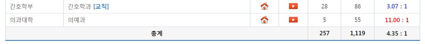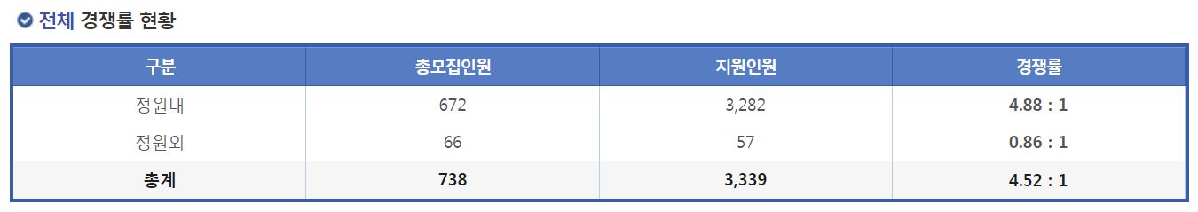 모든 전형을 통틀어 전체 경쟁률을 보자면, 올해 동아대학교의 정원내 경쟁률은 4.88:1 이었으며, 정원외 전형의 경쟁률은 0.86:1로 미달이었습니다.