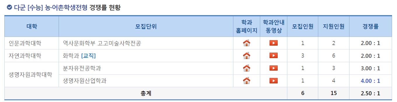 다군 [수능] 농어촌학생전형에서는 역사문화학부 고고미술사학전공, 화학과, 분자유전공학과, 생명자원산업학과의 신입생을 모집했습니다. 역사문화학부 고고미술사학전공의 경쟁률은 2.00:1, 화학과는 2.00:1, 분자유전공학과는 3.00:1, 생명자원산업학과는 4.00:1 이었습니다.