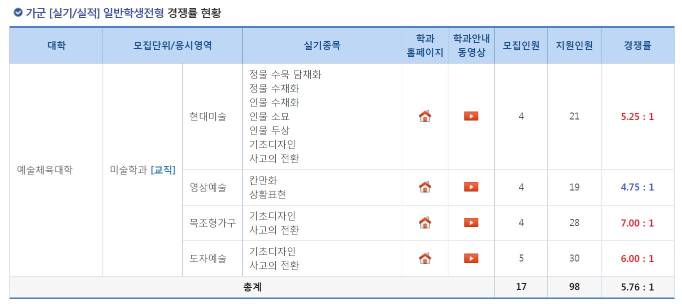 가군 [실기/실적] 일반학생전형에서는 미술학과(현대미술, 영상예술, 목조형가구, 도자예술)의 신입생을 모집했으며, 현대미술의 경쟁률은 5.25:1, 영상예술은 4.75:1, 목조형가구는 7.00:1, 도자예술은 6.00:1 이었습니다.