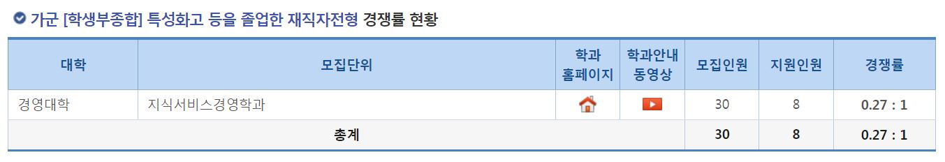 가군 [학생부종합] 특성화고 등을 졸업한 재직자전형에서는 지식서비스경영학과의 신입생을 모집했으며, 미달이었습니다.