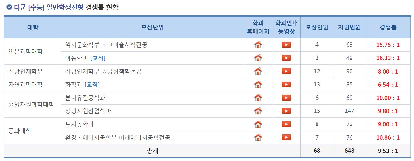 다군 [수능] 이랍ㄴ학생전형에서 가장 경쟁률이 높았던 학과는 아동학과(16.33:1), 역사문화학부 고고미술사학전공(15.75:1), 환경에너지공학부 미래에너지공학전공(10.86:1) 순이었습니다.