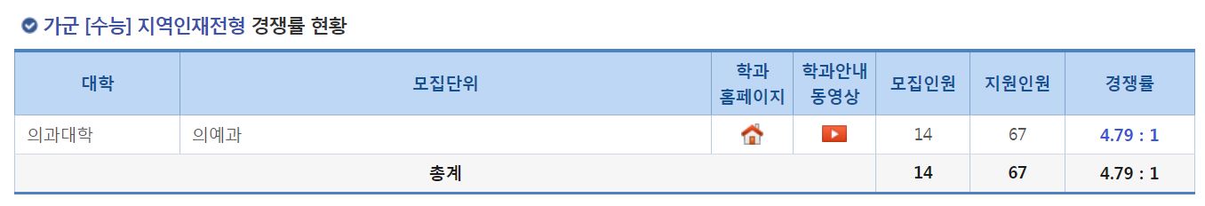 가군 [수능] 지역인재전형에서는 의예과 학생을 모집했으며, 경쟁률은 4.79:1 이었습니다.