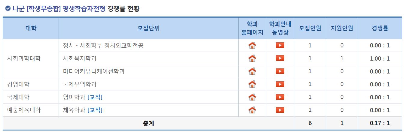 나군 [학생부종합] 평생학습자전형의 정치사회학부 정치외교학전공, 미디어커뮤니케이션학과, 국제무역학과, 영미학과, 체육학과는 미달이었으며, 사회복지학과의 모집인원과 지원인원은 같았습니다.