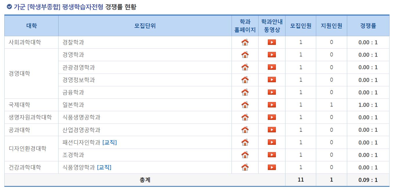 가군 [학생부종합] 평생학습자전형은 일본학과를 제외하고 모두 미달이었으며, 일본학과는 모집인원과 지원인원이 같았습니다.