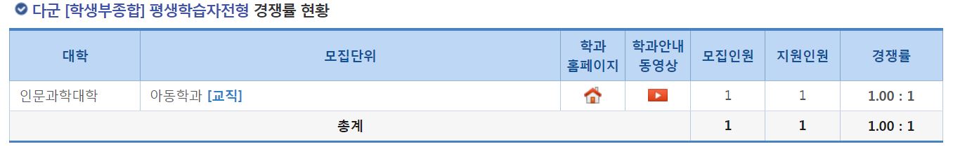 다군 [학생부종합] 평생학습자전형에서는 아동학과의 신입생을 모집했으며, 모집인원과 지원인원이 같았습니다.