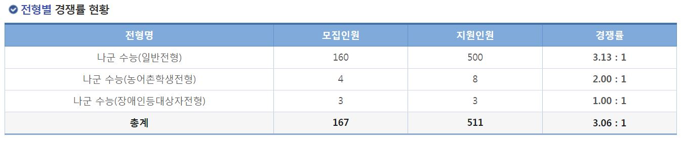 전형별 경쟁률 현황에 대해 살펴보자면, 나군 수능(일반전형)의 경쟁률은 3.13:1, 나군 수능(농어촌학생전형)의 경쟁률은 2.00:1, 나군 수능(장애인등대상자전형)은 모집인원과 지원인원이 같았습니다.