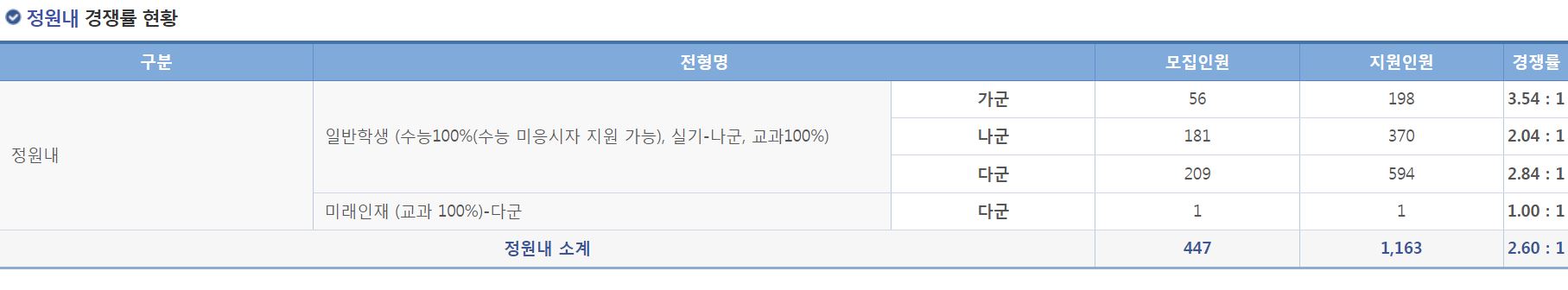 정원내 경쟁률 현황을 보자면, 미래인재(교과100%)-다군은 모집인원과 지원인원이 같았으며, 일반학생 가군의 경쟁률은 3.54:1, 일반학생 나군의 경쟁률은 2.04:1, 일반학생 다군의 경쟁률은 2.84:1 이었습니다.