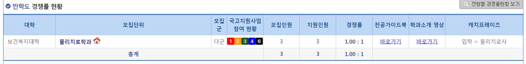 만학도 전형에서는 물리치료학과의 신입생을 모집했으며, 모집인원과 지원인원이 같았습니다.