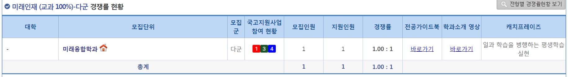 미래인재 (교과 100%) -다군에서는 미래융합학과의 신입생을 모집했으며, 모집인원과 지원인원이 같았습다.