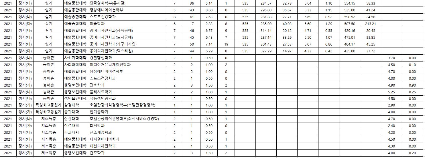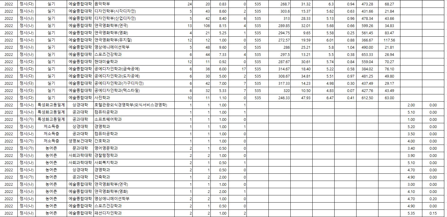 2022학년도에 경찰행정학과(농어촌), 스포츠건강학과(농어촌), 식품생명공학과(농어촌), 호텔관광외식경영학부(외식서비스경영학)(저소득층), 회계학과(저소득층), 신소재학과(저소득층), 디지털미디어학과(저소득층), 패션디자인학과(저소득층)이며, 경쟁률이 가장 높았던 학과는 연극영화학부(연극)(9.54:1), 영상애니메이션학부(8.60:1), 스포츠건강학과(7.63:1) 순이었습니다. 예체능이 강세를 보인 것을 알 수 있습니다.