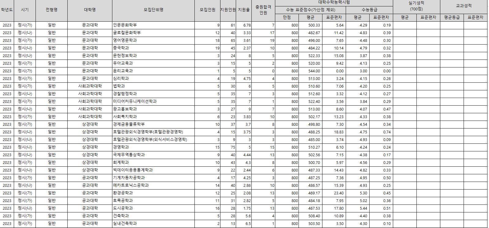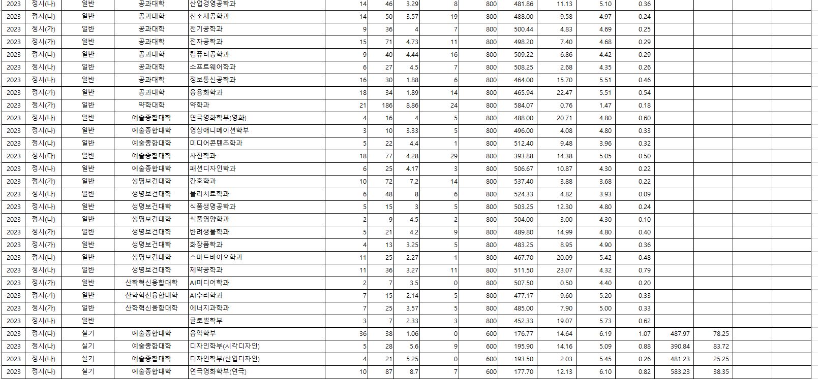 가군 : 인문문화학부, 영어영문학과, 유아교육과, 윤리교육과, 심리학과, 법학과, 미디어커뮤니케이션학과, 사회복지학과, 경제금융물류학부, 회계학과, 기계자동차공학과, 환경공학과, 토목공학과, 건축학과, 실내건축학과, 전기공학과, 전자공학과, 응용화학과, 약학과, 간호학과, 반려생물학과, 화장품학과, AI미디어학과, AI수리학과, 에너지과학과, 미디어커뮤니케이션학과(특성화고동일계), 회계학과(특성화고동일계), 전기공학과(특성화고동일계), 인문문화학부(저소득층), 미디어커뮤니케이션학과(저소득층), 경제금융물류학부(저소득층), 회계학과(저소득층), 실내건축학과(저소득층), 화장품학과(저소득층), 법학과(농어촌)