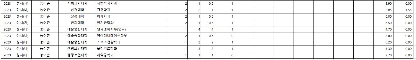 가군 : 인문문화학부, 영어영문학과, 유아교육과, 심리학과, 법학과, 미디어커뮤니케이션학과, 경제금융물류학부, 호텔관광외식경영학부(호텔관광경영학), 회계학과, 빅데이터응용통계학과, 응용수학과, 에너지과학과, 기계자동차공학과(기계자동차), 환경공학과, 토목공학과, 도시공학과, 건축학과, 전기공학과, 소프트웨어학과, 정보통신공학과, 간호학과, 화장품학과, 미디어커뮤니케이션학과(농어촌), 간호학과(농어촌), 호텔관광외식경영학부(호텔관광경영학)(특성화고동일계), 전기공학과(특성화고동일계), 회계학과(저소득층), 간호학과(저소득층)