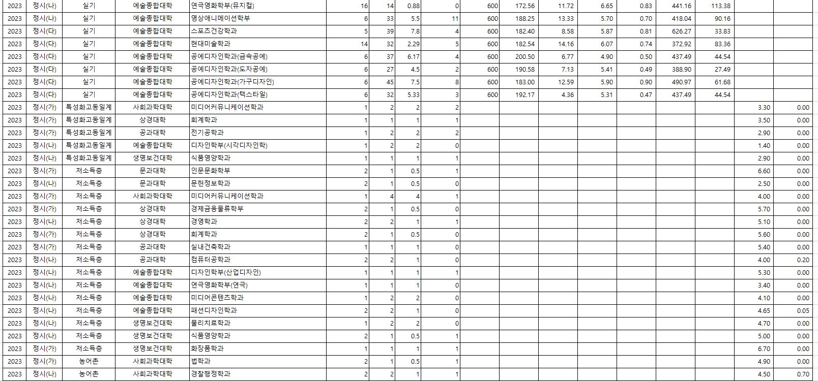 2023학년도 연극영화학부(뮤지컬), 인문문화학부(저소득층), 문헌정보학과(저소득층), 경제금융물류학부(저소득층), 회계학과(저소득층), 식품영양학과(저소득층), 법학과(농어촌)는 미달이었으며, 제일 경쟁률이 높았던 학과는 약학과(8.86:1), 연극영화학부(연극)(8.7:1), 공예디자인학과(가구디자인)(7.5:1) 순이었습니다.
