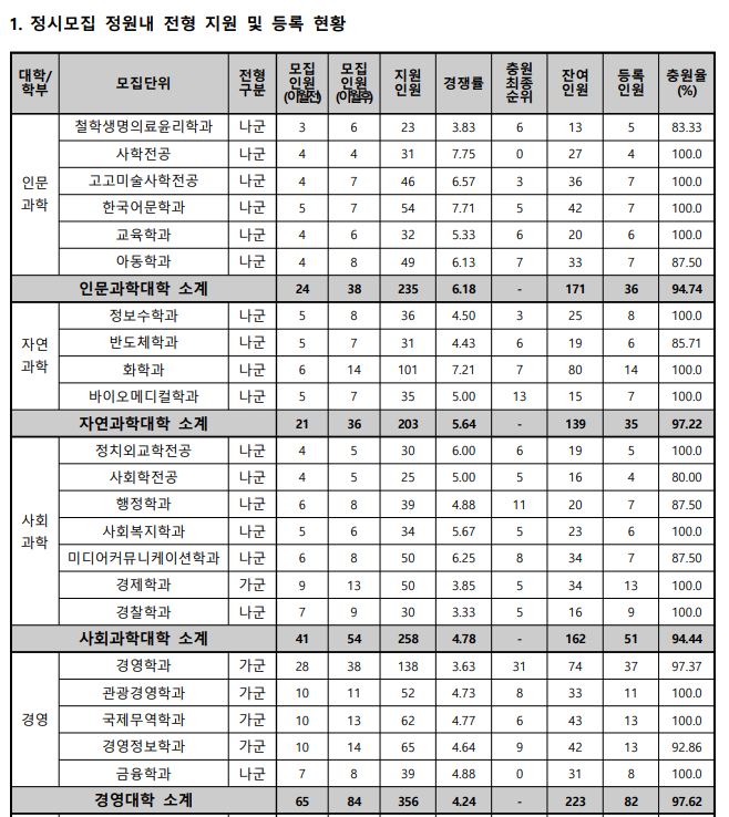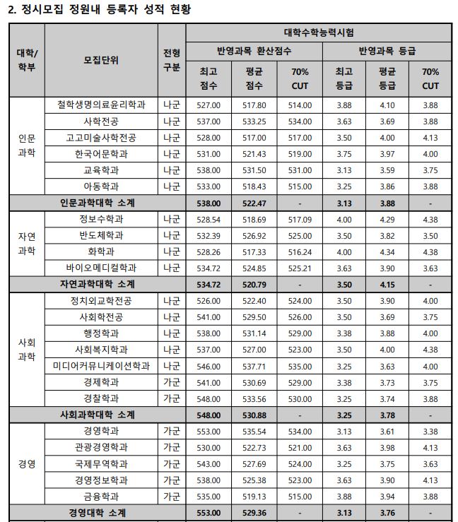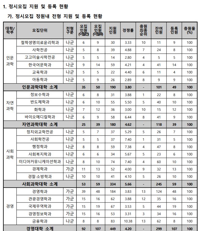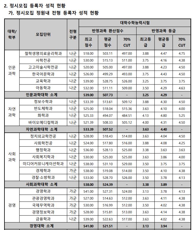 나군 : 철학생명의료윤리학과, 사학전공, 고고미술사학전공, 한국어문학과, 교육학과, 아동학과, 정보수학과, 반도체학과, 화학과, 바이오메디컬학과, 정치외교학전공, 사회학전공, 행정학과, 사회복지학과, 미디어커뮤니케이션학과, 경찰소방학과, 금융학과, 건축공학과, 건설시스템공학과, 환경안전전공, 미래에너지공학전공, 전자공학과, 화학공학과, 건축학과(5년제), 조경학과, 음악학과(피아노), 음악학과(성악), 음악학과(작곡), 음악학과(연주), 음악학과(보컬), 음악학과(실용작곡), 음악학과(관현악), 체육학과, 글로벌비즈니스학과, 영미학과, 중국학과