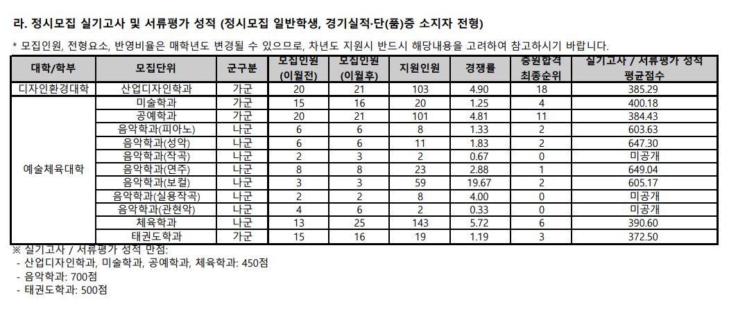 가장 경쟁률이 높았던 학과는 음악학과(보컬)(12.33:1), 체육학과(12.18:1), 금융학과(10.38:1) 순이었습니다.