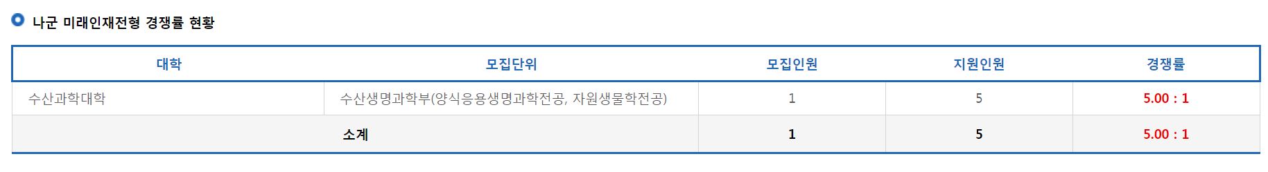 나군 미래인재전형에서는 수산생명과학부(양식응용생명과학전공, 자원생물학전공)의 신입생을 모집했으며, 경쟁률은 5.00:1 이었습니다.