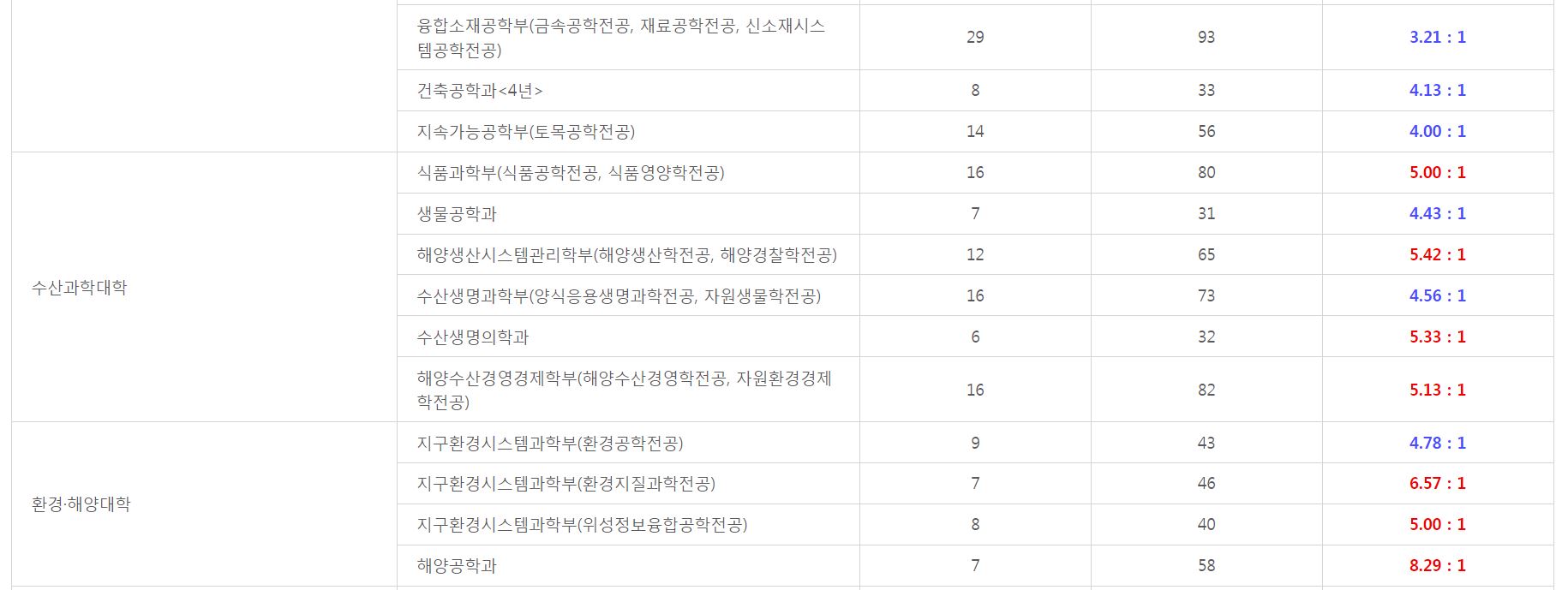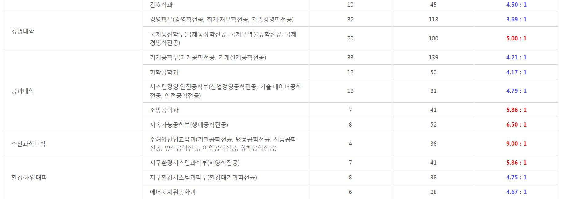 모든 전형을 통틀어 전체 경쟁률을 먼저 살펴보자면, 올해 부경대학교의 경쟁률은 5.00:1 이었습니다.
