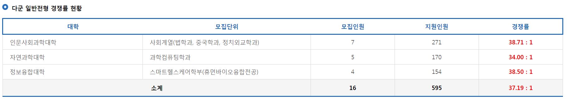 다군 일반전형에서는 사회계열(법학과, 중국학과, 정치외교학과), 과학컴퓨팅학과, 스마트헬스케어학부(휴먼바이오융합전공)에서 신입생을 모집했으며, 사회계열(법학과, 중국학과, 정치외교학과)의 경쟁률은 38.71:1, 과학컴퓨팅학과의 경쟁률은 34.00:1, 스마트헬스케어학부(휴먼바이오융합전공)의 경쟁률은 38.50:1 이었습니다.