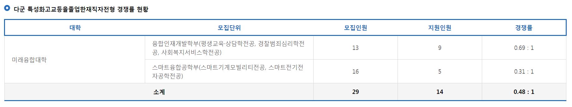 다군 특성화고교등을졸업한재직자전형에서는 융합인재개발학부(평생교육상담학전공, 경찰범죄심리학전공, 사회복지서비스학전공), 스마트융합공학부(스마트기계모빌리티전공, 스마트전기전자공학전공)의 신입생을 모집했으며, 모두 미달이었습니다.