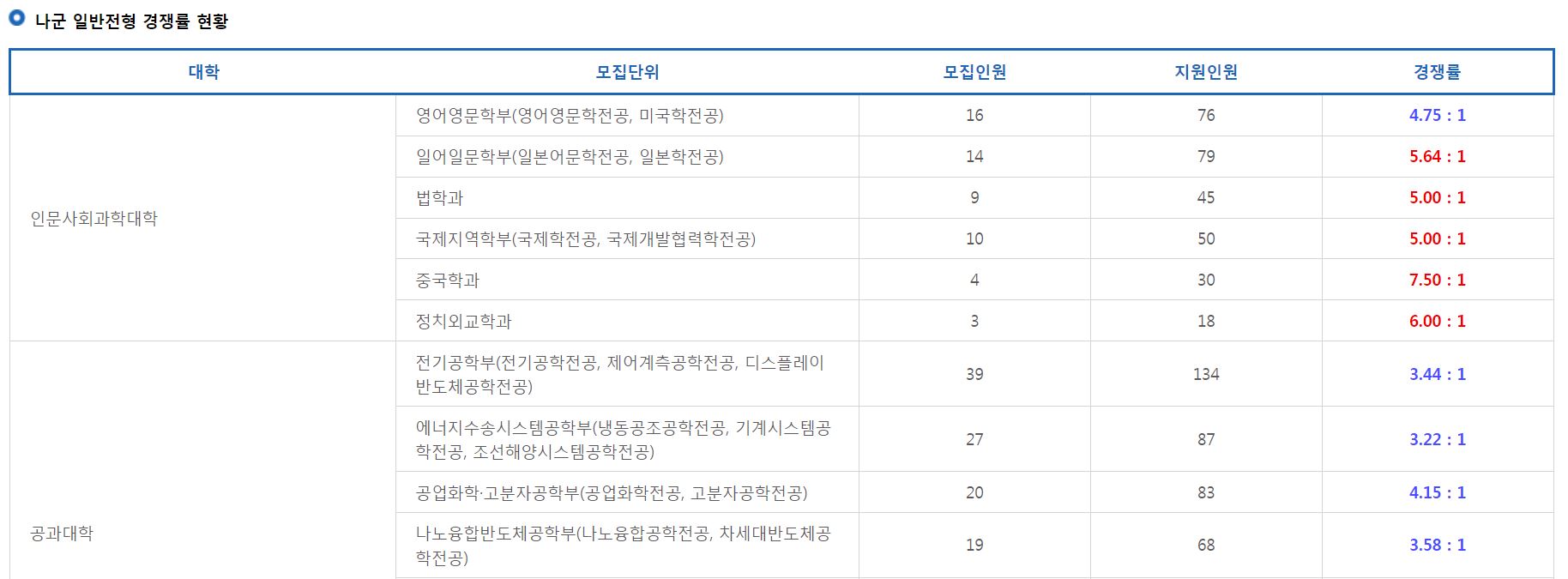 나군 일반전형에서 가장 경쟁률이 높았던 학과는 해양공학과(8.29:1), 중국학과(7.50:1), 디지털금융학과(6.67:1) 순이었습니다.