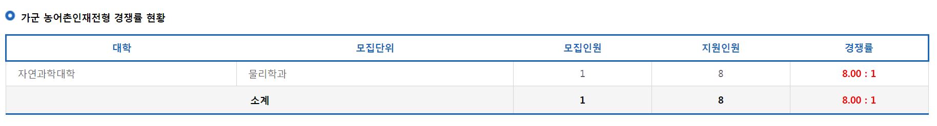 가군 농어촌인재전형에서는 물리학과의 신입생을 모집했으며, 경쟁률은 8.00:1 이었습니다.