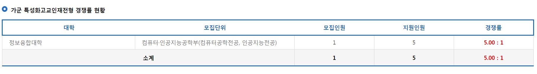 가군 특성화고교인재전형에서는 컴퓨터인공지능학부(컴퓨터공학전공, 인공지능전공) 신입생을 모집했으며, 경쟁률은 5.00:1 이었습니다.
