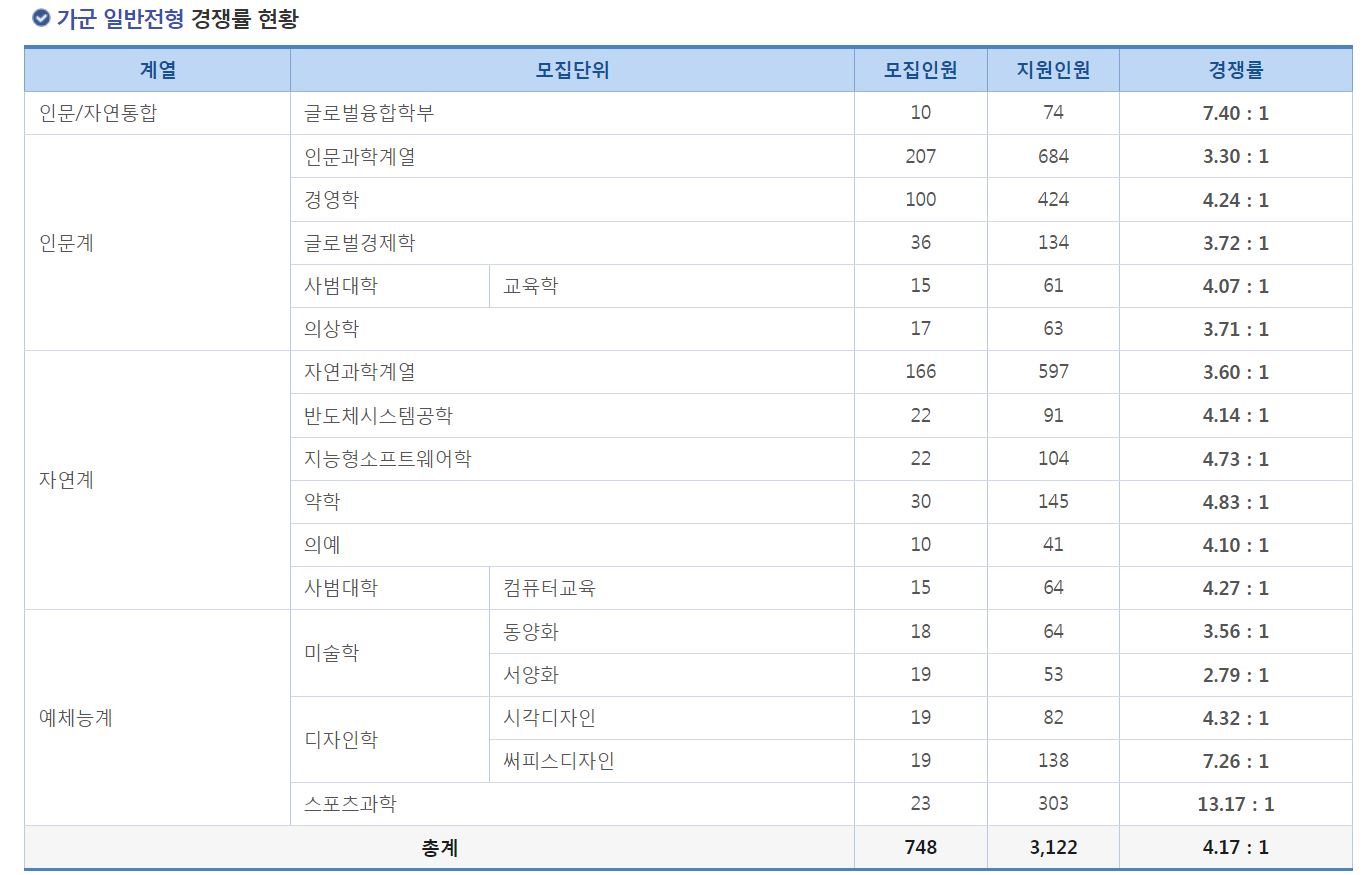 가군 일반전형에서 가장 경쟁률이 높았던 학과는 스포츠과학(13.17:1), 글로벌융합학부(7.40:1), 디자인학(써피스디자인)(7.26:1) 순이었습니다.