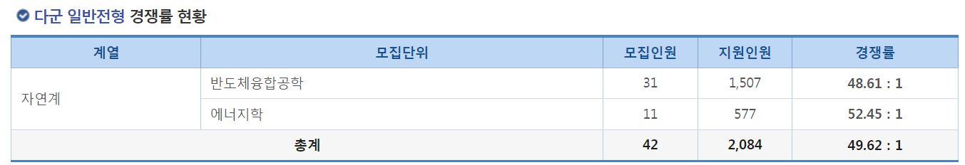 다군 일반전형에서는 반도체융합공학, 에너지학의 신입생을 모집했으며, 반도체융합공학의 경쟁률은 48.61:1, 에너지학의 경쟁률은 52.45:1 이었습니다.