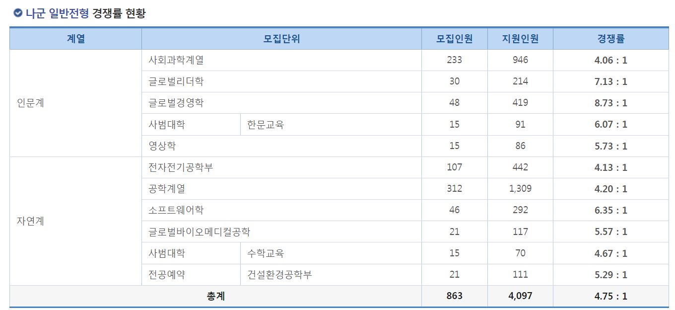 나군 일반전형에서 가장 경쟁률이 높았던 학과는 글로벌경영학(8.73:1), 글로벌리더학(7.13:1), 소프트웨어학(6.35:1) 순이었습니다.