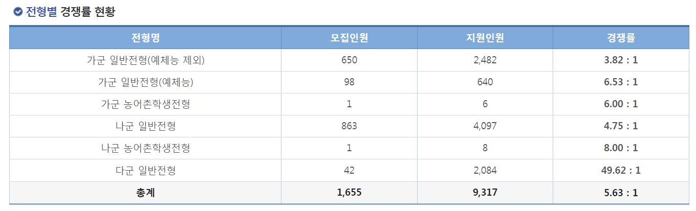 전형별 경쟁률 현황을 먼저 보자면, 가장 경쟁률이 높았던 전형은 다군 일반전형(49.62:1), 나군 농어촌학생전형(8.00:1), 가군 일반전형(예체능)(6.53:1) 순이었습니다.
