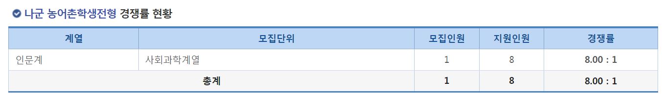 나군 농어촌학생전형에서는 사회과학계열의 신입생을 모집했으며, 경쟁률은 8.00:1 이었습니다.