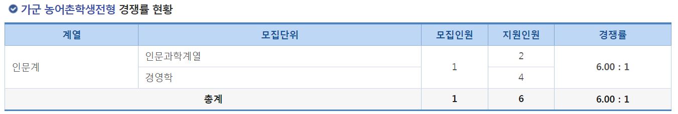 가군 농어촌학생전형에서는 인문과학계열, 경영학과의 신입생을 통합하여 모집했으며, 경쟁률은 6.00:1 이었습니다.