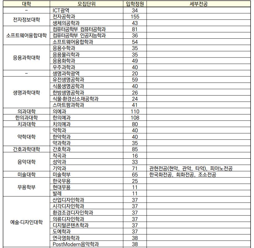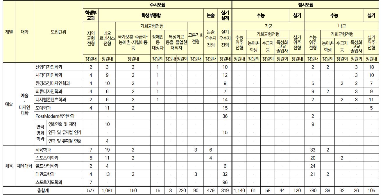 이 때, 무용학과와 스포츠지도학과는 수시모집에서 미충원인원이 있을 때에만 선발합니다.