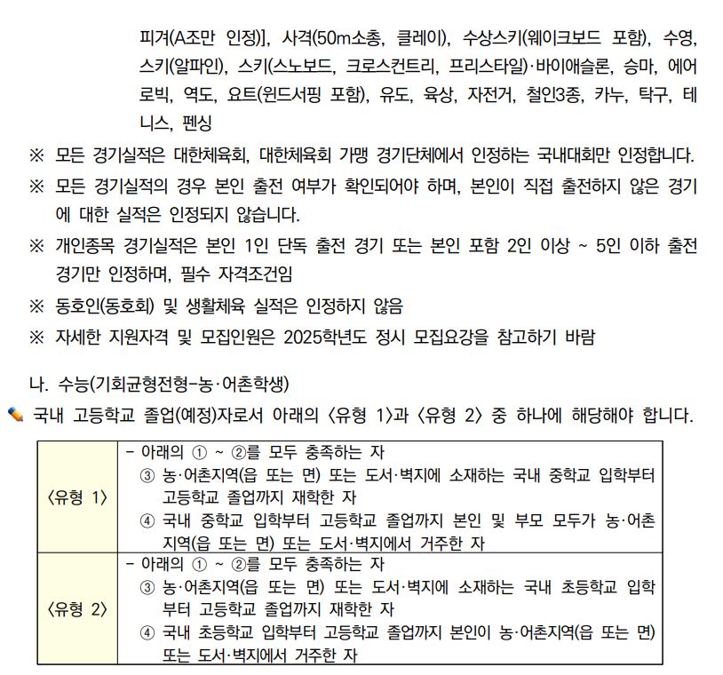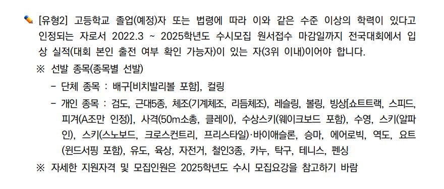 또한, 2022.3 ~ 2025학년도 수시모집 원서접수 마감일까지 전국대회 입상 실적이 3위 이내인 자도 지원 가능합니다. 단체 종목은 배구[비치발리볼 포함], 컬링 이며, 개인 종목은 검도, 근대5종, 체조(기계체조, 리듬체조), 레슬링, 볼링, 빙상[쇼트트랙, 스피드, 피겨(A조만 인정)], 사격(50m 소총, 클레이), 수상스키(웨이크보드 포함), 수영, 스키(알파인), 스키(스노보드, 크로스컨트리, 프리스타일), 바이애슬론, 승마, 에어로빅, 역도, 요트(윈드서핑 포함), 유도, 육상, 자전거, 철인3종, 카누, 탁구, 테니스, 펜싱입니다.