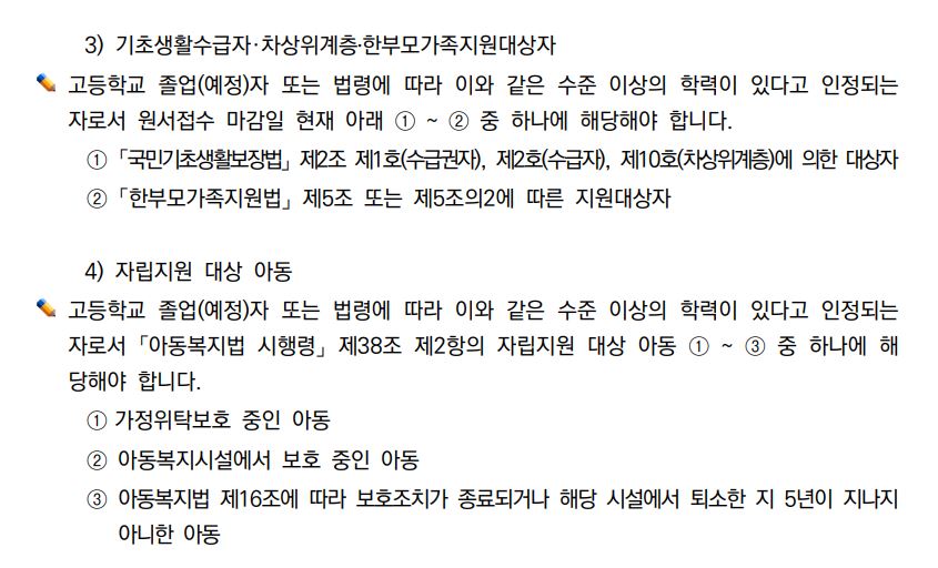 학생부종합(기회균형전형)은 국가보훈대상자, 농어촌, 수급자, 자립아동 등, 장애인 등 대상자, 특성화고 등을 졸업한 재직자들이 지원 가능합니다.