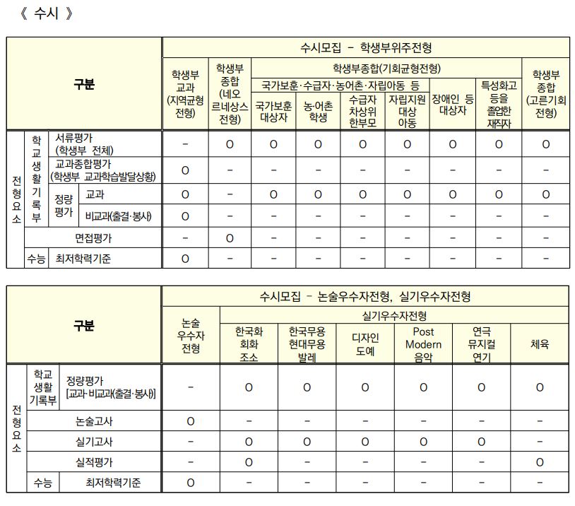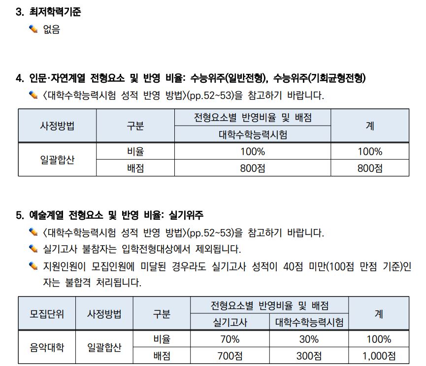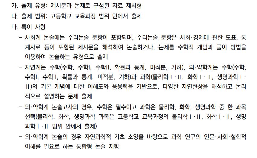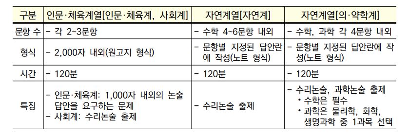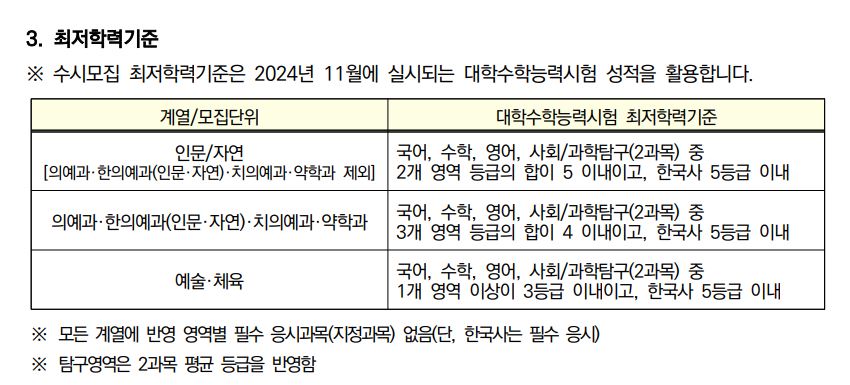 논술은 논술고사 성적만 100% 반영하여 학생을 선발합니다. 기존에는 교과를 반영했었지만 이제는 반영하지 않습다. 대신 최저학력기준을 맞춰야 하는데요, 인문 자연은 2합 5, 한국사 5 이내여야 하며, 의예과, 한의예과(인문/자연), 치의예과, 약학과는 3합 4 이내이면서 한국사 5 이내여야 합니다. 체육은 국수영탐 중 1개 영역 이상이 3등급 이내여야 하며 한국사가 5등급 이내여야 합니다.