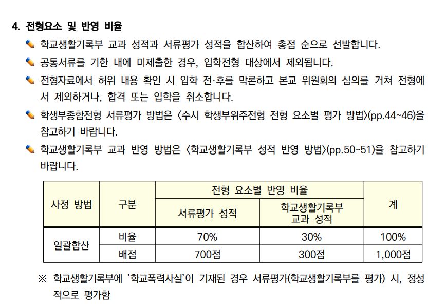 면접은 따로 진행하지 않으며, 서류 70% + 교과 성적 30%를 반영하여 학생을 선발합니다.