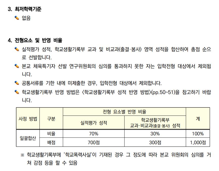 학생 선발은 학교생활기록부 70% + 교과종합평가 성적 30%를 반영하여 진행합니다.
